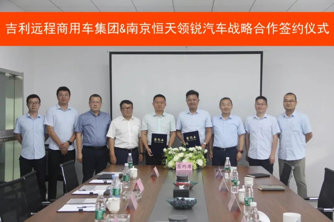 8月8日,吉利遠程商用車集團與恒天領銳汽車在南京簽訂了戰(zhàn)略合作框架協(xié)議。雙方將本著“平等互利、優(yōu)勢互補、協(xié)同合作、共同發(fā)展”的原則,充分發(fā)揮各自優(yōu)勢,圍繞“南京綠色渣運”項目的建設目標開展合作。 吉利遠程商用車集團CEO范現(xiàn)軍、恒天領銳董事長汪先鋒、 副總經(jīng)理段術林、副總裁劉文洲、銷售公司總經(jīng)理馬志鵬等出席簽約儀式。